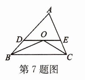 7. 如图所示,在$\triangle ABC$中,$\angle ABC$与$\angle ACB$的平分线相交于点$O$,过点$O$作$DE// BC$,分别交$AB$,$AC$于点$D$,$E$。若$AB=5$,$AC=4$,则$\triangle ADE$的周长是