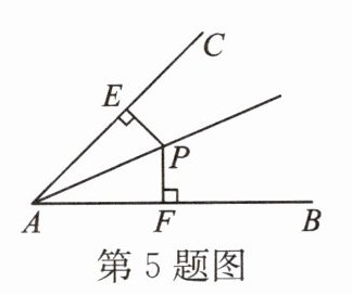 5. 如图所示,点 P 是$∠BAC$内一点,且点 P 到边 AB,AC 的距离相等,即$PF=PE$,则$△PEA\cong △PFA$的理由是(