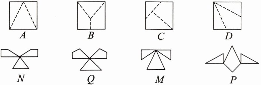 9. 如图所示,将编号为A,B,C,D的正方形沿图中的虚线剪开后,得到编号为N,Q,M,P的四个图形,试按照剪开前后图形的对应关系填空:A与