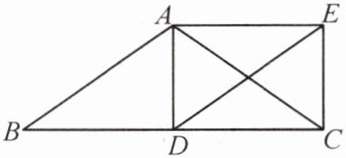 先证四边形$ADCE$为平行四边形,再由$AC=DE$,证得$□ ADCE$是矩形。