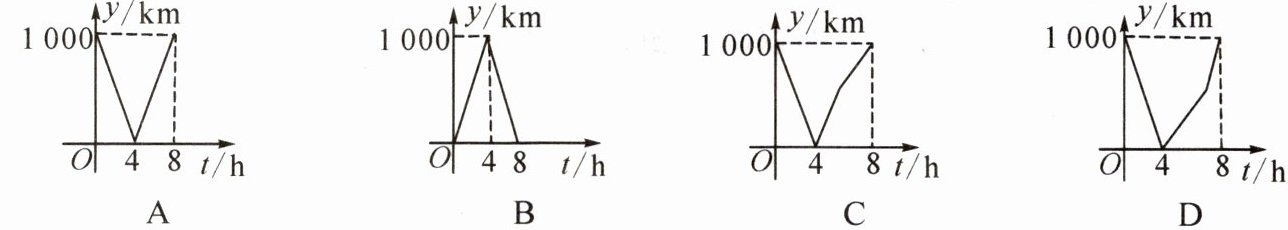 6. 一列快车从甲地驶往乙地,一列特快车从乙地驶往甲地,快车的速度为 $ 100 \mathrm { km } / \mathrm { h } $,特快车的速度为 $ 150 \mathrm { km } / \mathrm { h } $,甲、乙两地之间的距离为 $ 1000 \mathrm { km } $,两车同时出发,则图中折线大致表示两车之间的距离 $ y ( \mathrm { km } ) $ 与快车行驶时间 $ t ( \mathrm { h } ) $ 之间的函数图象是(