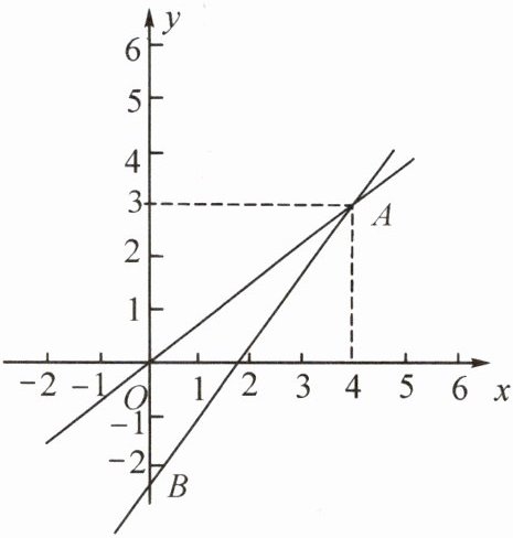 14. 正比例函数与一次函数的图象如图所示,它们的交点坐标为 $ A ( 4, 3 ) $,点 $ B $ 为一次函数的图象与 $ y $ 轴的交点,且 $ O A = 2 O B $。