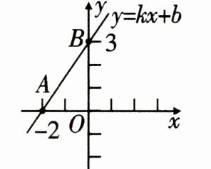 5. 如图,直线 $ y = k x + b $ 交坐标轴于 $ A ( - 2, 0 ) $, $ B ( 0, 3 ) $ 两点,则不等式 $ k x + b > 0 $ 的解集是 (