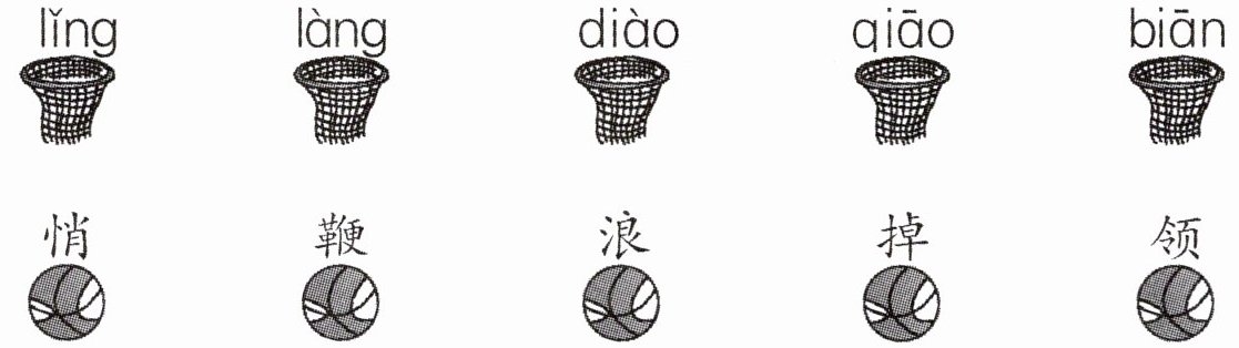 lǐng — 领;làng — 浪;diào — 掉;qiāo — 悄;biān — 鞭。