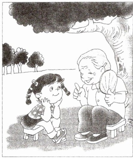 爷爷一边摇着扇子,一边给小红讲着有趣的故事。