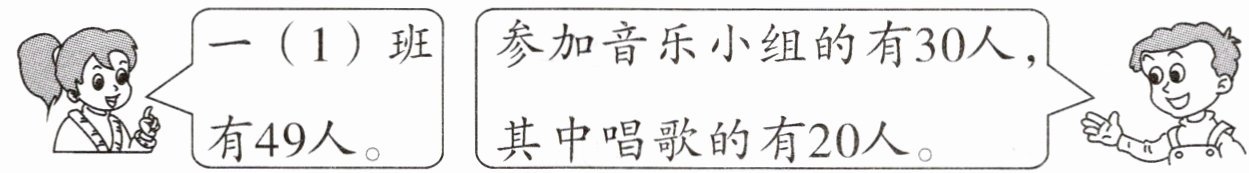 (1)已知一(1)班总人数是$49$人,参加音乐小组的有$30$人,求没参加音乐小组的人数,用总人数减去参加音乐小组的人数即可。