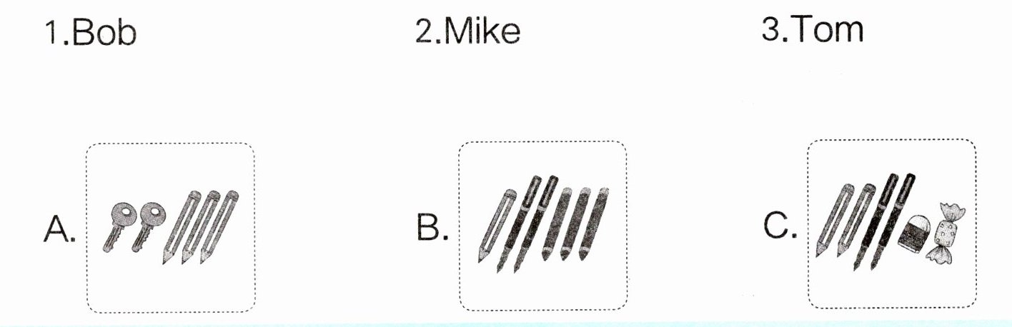 ) 3. There is a key in Tom’s pencil box.(二) 阅读对话,将物品与对应的人物连线。
