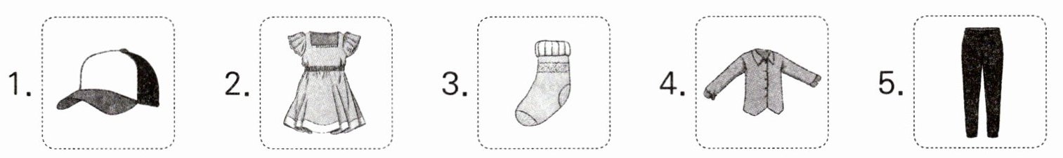 1.shorts 2.shoes 3.sweater 4.coat 5.dress 6.shirt