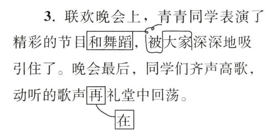 联欢晚会上,青青同学表演了精彩的节目和舞蹈,被大家深深地吸引住了。晚会最后,同学们齐声高歌,动听的歌声再礼堂中回荡。