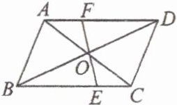 18. 如图,四边形$ABCD$中,过对角线交点$O$,引一直线交$BC$于$E$,交$AD$于$F$,若$AB = 2.4cm$,$BC = 4cm$,$OE = 1.1cm$,则四边形$CDFE$的周长为