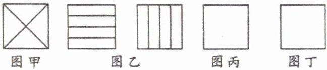 25. 如图,为了美化环境,在一块正方形空地上分别种植四种不同的花草.现将这块空地按下列要求分成四块:(1)分割后的整个图形必须是轴对称图形;(2)四块图形形状相同;(3)四块图形面积相等.现已有两种不同的分法:(1)分别作两条对角线(如图甲);(2)过一条边的四等分点作这边的垂线段(图乙)(图乙中两个图形的分割看作同一方法).请你按照上述三个要求,分别在下面两个正方形中给出另外两种不同的分割方法.(正确画图,不写画法)