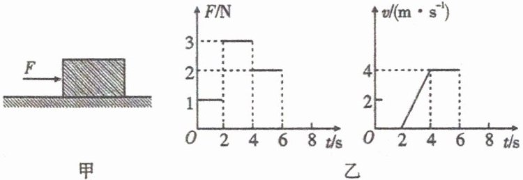 6. (成都)如下图甲所示,放在水平地面上的物体,受到方向不变的水平推力 F 的作用,F 的大小与时间 t 的关系和物体运动速度 v 与时间 t 的关系如下图乙所示. 由图象可知当 t=1s 时,物体处于