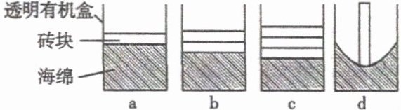 12. 在探究“压力的作用效果与哪些因素有关”实验中,小聪对实验器材做了一些改进,如下图所示,在有机透明盒里放入一块海绵和砖块进行实验。