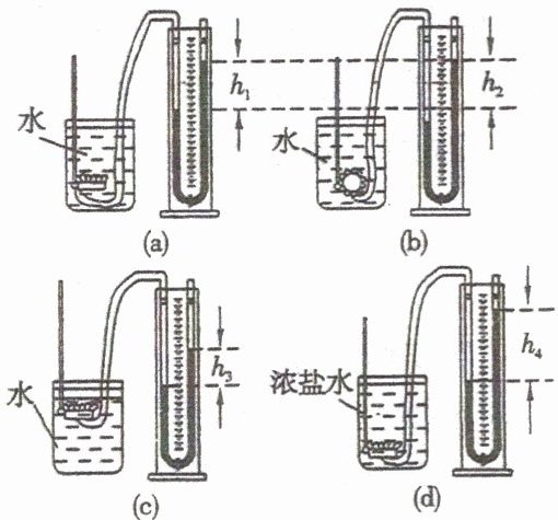 13. “帕斯卡裂桶实验”的演示,激发了学生“探究影响液体压强大小因素”的兴趣。他们设计了如下图所示的实验探究方案,图(a)、(b)、(d)中金属盒在液体中的深度相同。实验测得几种情况下压强计的U形管两侧液面高度差的大小关系是$ h_4 > h_1 = h_2 > h_3 $。