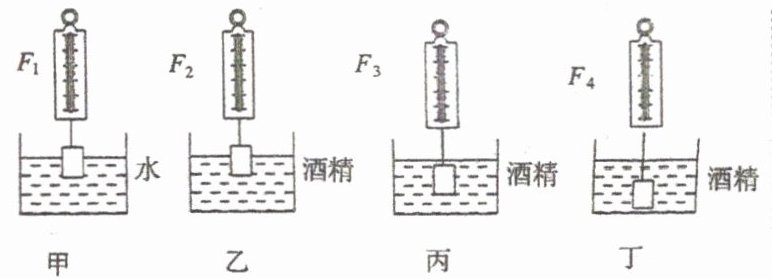 实验中保持物体处于静止状态,图甲和图乙中物体露出液面的体积相等,弹簧测力计测得的拉力大小的关系是: $ F_{1}<F_{2} $, $ F_{2}>F_{3}=F_{4} $,则: