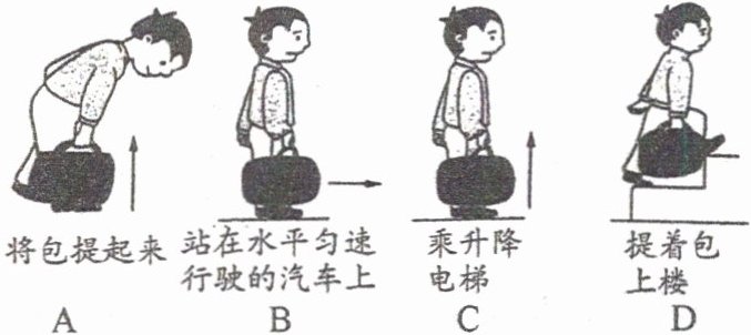 【剖析】 本题的四幅图中,小新提包的力均向上,在 A 图中,将包提起来,包在向上的方向上通过了距离,所以提包的力做了功;在 B 图中,包在水平方向通过了距离,在竖直方向上没有通过距离,所以此力不做功;在 C、D 两图中,包在向上的方向上都通过了距离,所以两图中的力均做了功.