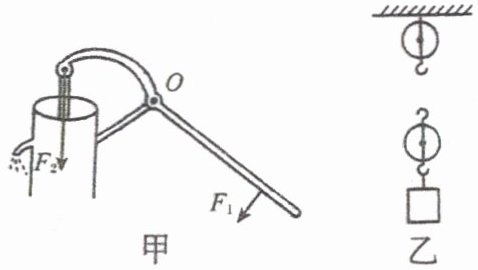 (1)有一种在农村普遍使用的活塞式抽水机,它的柄如下图甲所示,根据图中提供的动力F₁及阻力F₂的方向,画出动力臂l₁及阻力臂l₂.