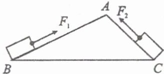 9. 如下图所示,AB、AC为两个等高的斜面,且AB>AC,沿斜面AB和AC分别将同一重物从底部匀速拉到顶端,所用拉力分别为F₁和F₂,所做的功分别为W₁和W₂,若不考虑摩擦,则(