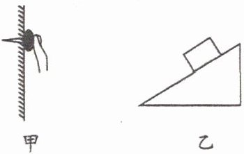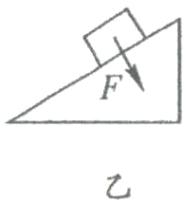 9. 如下图所示,甲:用手指向墙上按图钉;乙:木块静止在斜面上.请在图中分别画出手指对图钉帽及木块对斜面的压力的示意图.