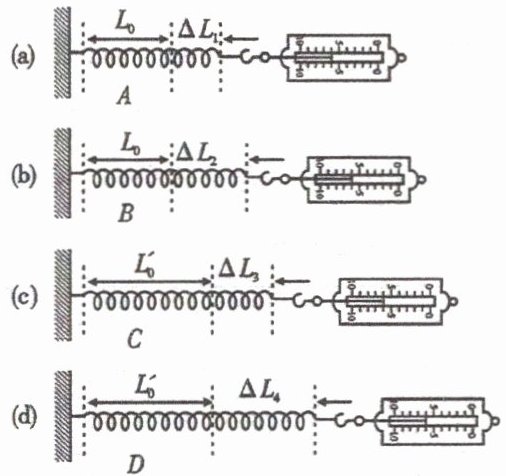 11. 为了研究受到拉力时弹簧长度的增加量与弹簧自身因素的关系,小华同学选用弹簧$A$、$B$、$C$、$D$和测力计进行实验. 已知弹簧$A$、$C$由同种金属丝绕制而成. 弹簧$B$、$D$由另一种金属丝绕制而成.$A$、$B$原来的长度均为$L_{0}$.$C$、$D$原来的长度均为$L_{0}'$,且$A$、$B$、$C$、$D$的横截面积均相同;他将弹簧$A$、$B$、$C$、$D$的左端固定,并分别用水平向右的力通过测力计拉伸弹簧,它们的长度分别增加了$\Delta L_{1}$、$\Delta L_{2}$、$\Delta L_{3}$和$\Delta L_{4}$,如下图$(a)$、$(b)$、$(c)$、$(d)$所示. 请仔细观察实验现象,归纳得出初步结论.