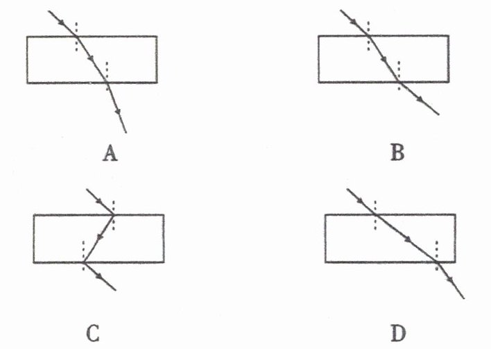 7. 让一束光斜射向一块玻璃砖,这束光射人玻璃和射出玻璃后的光路正确的是下图中的 (