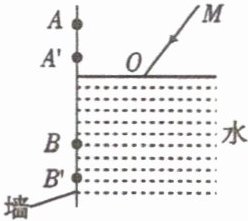 17. 小芸同学用一支新买的激光笔照射水平水面,在竖直白墙上出现了两个红色亮点 $ A $ 和 $ B $, 如右图所示. 现保持人射点 $ O $ 的位置不变,欲使光点 $ A $ 下移至 $ A' $ 处,应使人射光线 $ MO $ 绕着点 $ O $ 沿