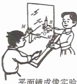 13. 如右图,是小明和小丽在做平面镜成像的实验,结果表明点燃的蜡烛所在位置 $ A $ 点与它在平面镜中所成像的位置 $ B $ 点到平面镜的距离 ______