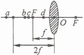 8. 某同学在做凸透镜成像的实验时,保持凸透镜位置不变,如下图所示,先后使蜡烛们于a、b、c、d四点,并分别调整光屏的位置,观察烛焰分别在a、b、c、d四点的成像情况,他归纳出下列说法,其中错误的是(