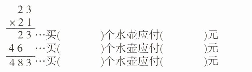 1. 幼儿园买了 21 个水壶,每个 23 元,根据下面的竖式,在括号里填上合适的数。