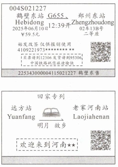 (2)大家都在为宣传推广“老家河南”文旅品牌献计献策,小化同学展示了自己仿照真实高铁票(图一)设计的一张宣传卡片(图二)。请你结合活动主题,说说这张宣传卡片设计的巧妙之处。要求:观点明确,语句通顺,80字左右。