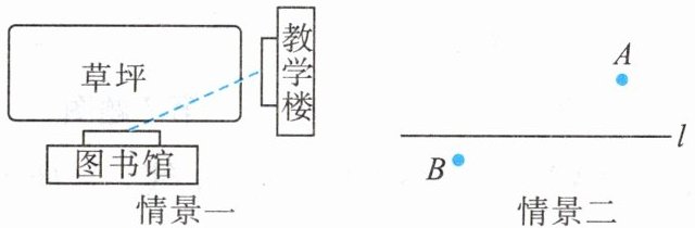 解: 情景一: 横穿草坪是为了所走路程最短. 因为两点之间的所有连线中, 线段最短. 理由: 两点之间的所有连线中,线段最短,赞同情景二中的做法.