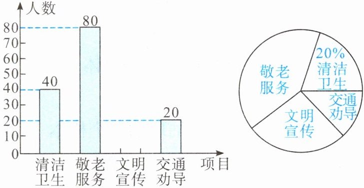 14.(20分)某市某校组织本校学生参加“市志愿者服务”活动,其服务项目有“清洁卫生”“敬老服务”“文明宣传”“交通劝导”,每名参加志愿者服务的学生只参加其中一项.为了解各项目参与情况,该校随机调查了部分参加志愿者服务的学生,将调查结果绘制成如下两幅不完整的统计图.