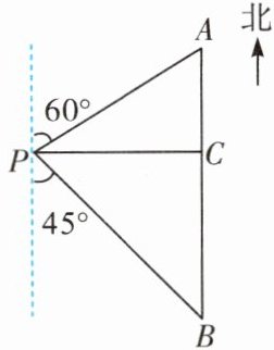 20. (10分)如图,在一次数学课外活动中,小明同学在点P处测得教学楼A位于北偏东$60^{\circ}$方向上,办公楼B位于南偏东$45^{\circ}$方向上.小明沿正东方向前进60 m到达C处,此时测得教学楼A恰好位于正北方向,办公楼B恰好位于正南方向.求教学楼A与办公楼B之间的距离(结果精确到0.1 m).