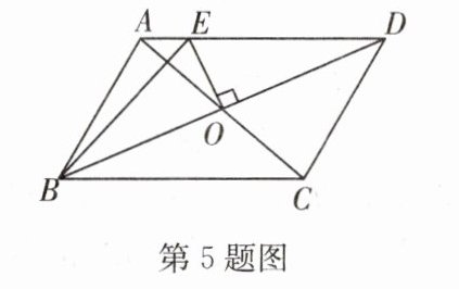 5. 如图,$ □ ABCD $ 中,对角线 $ AC $,$ BD $ 相交于点 $ O $,$ OE \perp BD $ 交 $ AD $ 于点 $ E $,连接 $ BE $。若 $ □ ABCD $ 的周长为 $ 28 $,则 $ \triangle ABE $ 的周长为(