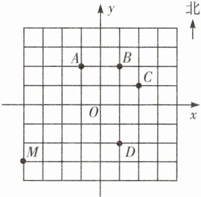 5. 如图,小明从点$O$出发,先向西走40m,再向南走30m到达点$M$.如果点$M$的位置用$(-40,-30)$表示,那么$(-10,20)$表示的位置是 (