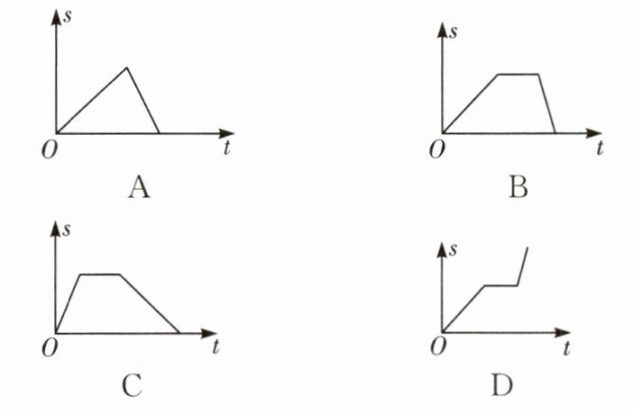 6.(随州中考)小明从家出发步行至学校,停留一段时间后乘车返回,则下列函数图象最能体现他离家的距离(s)与出发时间(t)之间的对应关系的是(