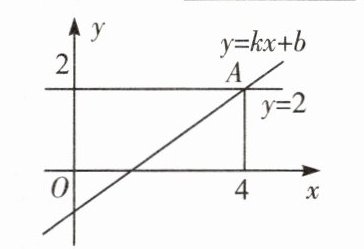 14.(遵义中考)如图,直线$y=kx+b$(k,b是常数,$k≠0)$与直线$y=2$交于点$A(4,2)$,则关于x的不等式$kx+b<2$的解集为