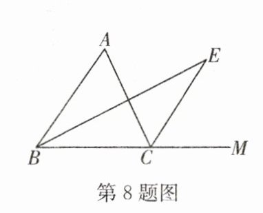 8. 如图,在$\triangle ABC$中,BE是$∠ABC$的平分线,CE是外角$∠ACM$的平分线,BE与CE相交于点E,若$∠A=60^{\circ}$,则$∠BEC$是 (