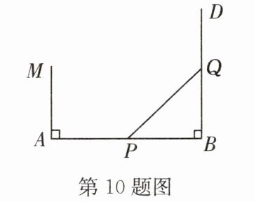 10. 如图,已知线段$AB = 18$ m,$MA \perp AB$于点A,$MA = 6$ m,射线$BD \perp AB$于点B,P点从B点向A运动,每秒走1 m,Q点从B点向D运动,每秒走2 m,P,Q同时从B出发,则出发x s后,在线段MA上有一点C,使$\triangle CAP$与$\triangle PBQ$全等,则x的值是 (