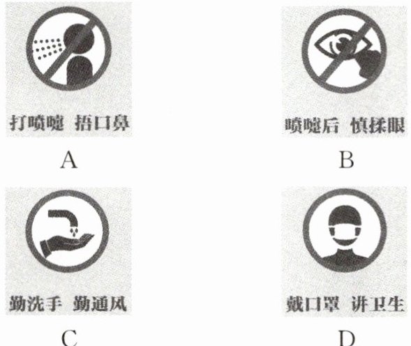 1. (山西中考)自新冠肺炎疫情发生以来,全国人民共同抗疫,各地积极普及科学防控知识,下面是科学防控知识的图片,图片上有图案和文字说明,其中的图案是轴对称图形的是 (