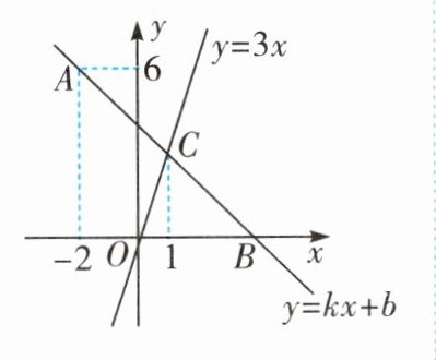 (1)由C点的横坐标为1,且在y=3x的图象上,故C点坐标为(1,3).将A,C点的坐标代入y=kx+b,得$\begin{cases} 6 = -2k + b, \\ 3 = k + b, \end{cases}$解得$\begin{cases} k = -1, \\ b = 4. \end{cases}$