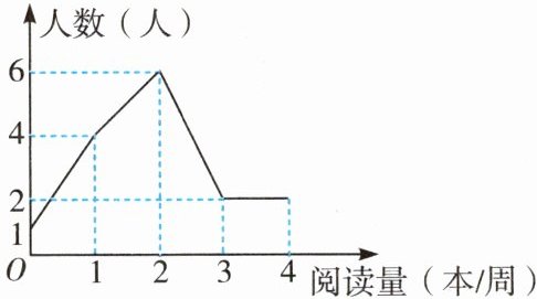 【解析】:由折线统计图可知,阅读量为$2$本的人数最多,所以众数是$2$;将$15$名同学的阅读量从小到大排列为$0$,$1$,$1$,$1$,$1$,$2$,$2$,$2$,$2$,$2$,$2$,$3$,$3$,$4$,$4$,中间位置的数是第$8$个数,即$2$,所以中位数是$2$;平均数为$(0×1 + 1×4 + 2×6 + 3×2 + 4×2)÷15 = 2$。