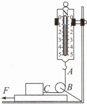 13. (10分)小勇利用如图所示的实验装置探究影响滑动摩擦力大小的因素,在水平桌面边缘固定一个定滑轮,将弹簧测力计在竖直方向调零后如图固定。在桌面放置一块长木板,将一个长方体木块平放在长木板上,通过细线绕过定滑轮与测力计相连,并保持细线的AB段竖直、BC段水平。水平向左拉动长木板,木块相对于桌面保持静止,不计细线的重力和滑轮处的摩擦力。