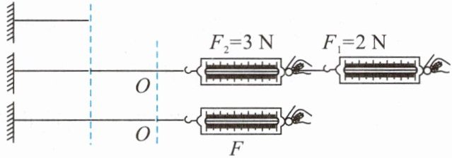 9. 如图所示是“研究同一直线上同方向两个力的合力”的实验中出现的情景,在实验中两次分别使同一根橡皮筋都拉伸到同一点O,目的是为了使两次实验中力的作用效果