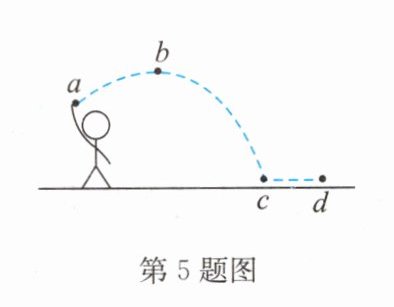 5. (枣庄中考) 在体育测试中, 小明同学掷实心球的场景如图所示, 图中 $ a $ 点是球刚离开手的位置。球从 $ a $ 点上升到最高点 $ b $ 后下落到地面 $ c $ 点, 然后滚动到 $ d $ 点停止, 下列说法正确的是 (