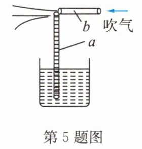 5. 如图所示,把长约20cm的饮料吸管从中部剪开(但不要彻底剪断)并弯折过来,将其中一段吸管a插在盛水的烧杯中,从另一段吸管b的管口用力吹气,水将从a管的管口喷出,且成雾状,这是因为吹气时 (