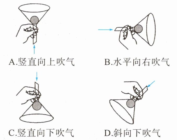 2.(苏州中考)小明采用“向漏斗口吹气,观察乒乓球状态”的方法来探究流速对流体压强的影响。以下方案不合理的是(