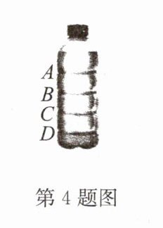 4.(株洲中考)竖直放置一矿泉水瓶子,并在侧壁钻A、B、C、D四个一样大小的小孔,打开瓶盖,往瓶中注满水,水将从瓶孔喷出。水喷出速度最大的是从哪一个小孔喷出的(