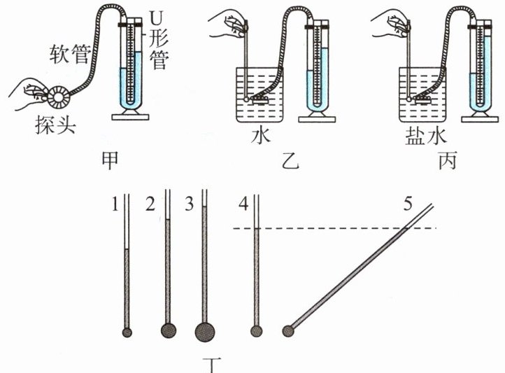 (3)换用五根一端蒙有相同橡皮膜的玻璃管(粗细相同),探究影响液体压强大小的因素。管中加入适量的水,如图丁所示。