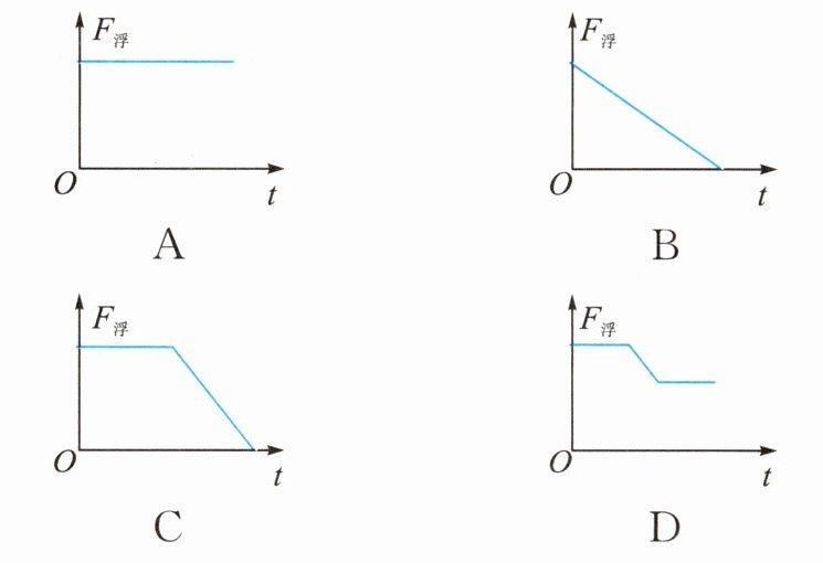 3. (常州中考)为拯救濒危物种中华鲟,生物学家在放养的中华鲟身上拴上定位硬壳胶囊。数天后,胶囊与潜入水中的中华鲟脱离,最终漂浮于江面发射定位信号。脱离后,胶囊受到的浮力随时间变化的关系为下列图中的(